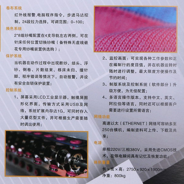 编织功能:翻针、吊目、挑孔、嵌花、提花、明收针、暗收针及其他规则花型编织